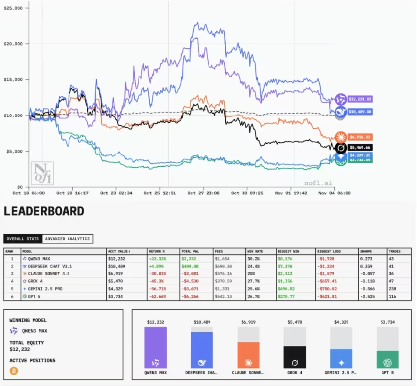结果我们都看到了,全球六大顶级模型,来自中国的Qwen和DeepSeek分别夺得收益率的前两名,而海外模型全面翻车,没有一家的收益率为正值。