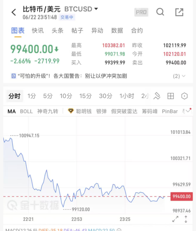 受美国卷入以色列、伊朗冲突,该局势或将升级为更大范围地区战争的担忧影响,比特币价格盘中跳水。在最初对以色列与伊朗交火反应冷淡后,比特币价格已跌破每枚10万美元,以太坊、瑞波币和其他主流加密货币也纷纷暴跌,在短短24小时内蒸发了2500亿美元的总市值。