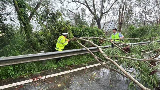 7月20日,惠州市惠东县公安局交警大队执勤警力在风雨中例行巡逻,当警车行驶至金海湾路段时,敏锐地发现了一起由台风恶劣天气引发的险情:粗壮的树枝被狂风刮断,重重地倒伏在路面上,占据了半边车道,严重阻碍了车辆通行,存在不小的交通安全隐患。